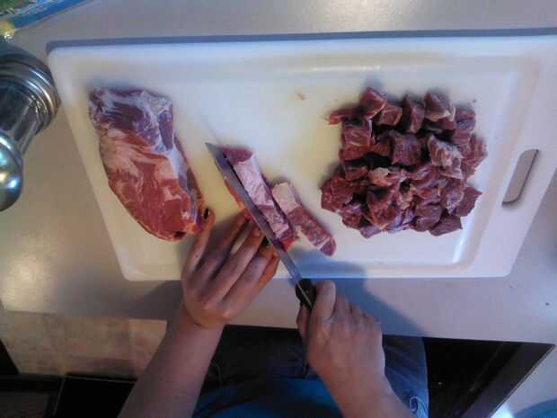 Corte plato asado en cubos de 1 pulgada o cualquier tamaño es requerido por la máquina para picar carne.  Encuentro 1/2 a 1 pulgada funciona mejor.