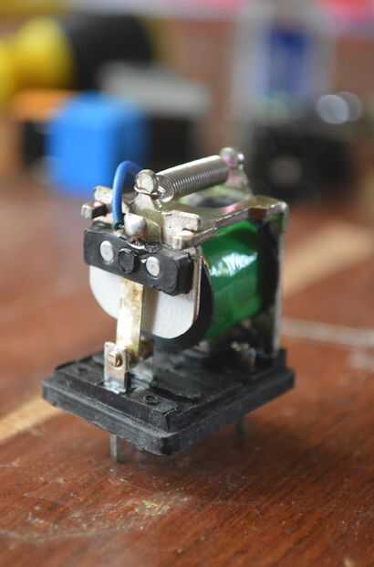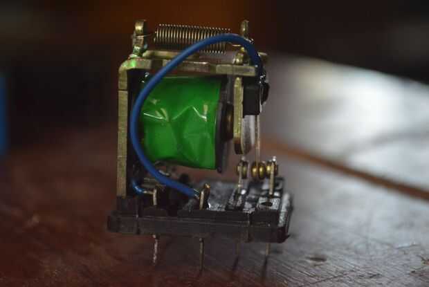 Un simple relé electromagnético se compone de una bobina de alambre envuelto alrededor de un núcleo de hierro dulce, un yugo de hierro que proporciona un camino de baja reluctancia para el flujo magnético, una armadura de hierro móvil y uno o más conjuntos de contactos (hay dos en el relevo en la foto). La armadura con bisagras para el yugo y mecánicamente ligada a uno o más conjuntos de contactos en movimiento. Se llevó a cabo en lugar por un resorte para que cuando el relé es desenergizado hay un boquete de aire en el circuito magnético. En esta condición, uno de los dos conjuntos de contactos en el relevador en la foto se cierra, y el otro juego está abierto. Otros relés pueden tener más o menos sistemas de contactos dependiendo de su función. El relé en la imagen también tiene un cable conectar la armadura al yugo. Esto asegura la continuidad del circuito entre los contactos móviles de la armadura, y el circuito de la pista en la placa de circuito impreso (PCB) vía el yugo, que es soldado a la PCB.