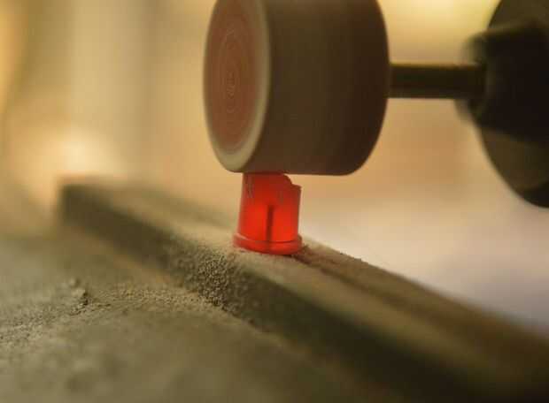 - Vista superior de los Electodes del LED. (cátodo más grande, más pequeño ánodo).