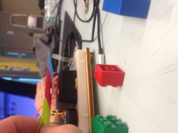 Hoja de datos dice que el sensor comunica un cambio de color dentro de 2ms. Probamos esto conectando la salida del sensor de color con un piezoeléctrico que jugó un tono diferente por color. Luego poner una rueda con diferentes colores en ellas y lo hizo girar.