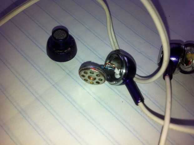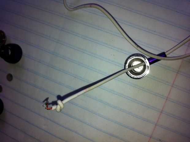 Paso 1. Separe los auriculares con cuidado, a lo largo de una costura en la carrocería de plástico. Puede utilizar un destornillador pequeño aquí, pero ser lento y cuidadoso. Aquí tuve que, venían aparte ya! Una vez que vea los cables, está en la parte posterior del elemento de altavoz. ¡Ten cuidado! No levante el altavoz hacia fuera, como usted puede cortar muy fácilmente los dos alambres muy pequeños desde los pads de soldadura a la bobina en el diafragma. Son protegidos por un pequeño drible de goma cemento compuesto. Pero no protege de la punta de un destornillador pequeño. Si usted toma un destornillador de tipo de lente regular pequeña reparación y raspa alrededor del borde del elemento de altavoz, donde se une al cuerpo de plástico, usted puede generalmente hacer girar, o haz una captura pequeña en el borde del metal del altavoz que cuidadosamente puede facilitar él hacia fuera lo suficiente para agarrar. Una vez más, tenga cuidado de esos dos cables pequeños. No rasque en su lado del altavoz, seguro.