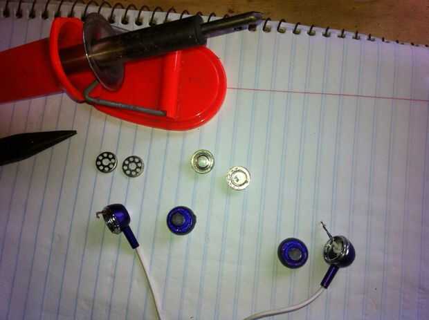 Paso 3. Las imágenes muestran bastante bien los pasos de desarmar los audífonos. Sólo tenga cuidado y no maltratar el diafragma del altavoz con los dedos. Guardar las piezas útiles, pero lo que necesitamos para este proyecto son los elementos del altavoz, altavoz elemento protectores y el cable. Si los altavoces tienen su protector de altavoz, luego déjelos! Protegerá al tocar el diafragma. Quité para sólo este Instructable.