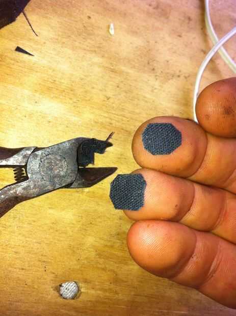 Paso 2. Cortar 2 círculos pequeños de un trozo de cinta aislante estándar con unas tijeras o un cortador de alambre. Deben ser sólo lo suficientemente grandes como para cubrir las conexiones eléctricas detrás del altavoz, donde se conectan los cables. Empuje firmemente, círculos en altavoz para que las conexiones están bien cubiertas. Cortar 6 más círculos del mismo tamaño de la cinta de fricción esta vez y la capa sobre la cinta aislante en la parte posterior del altavoz, 3 por lado. Si no tienes cinta de fricción, utilizar cinta aislante. Esto actúa como un espaciador y mantiene el altavoz en su sitio.