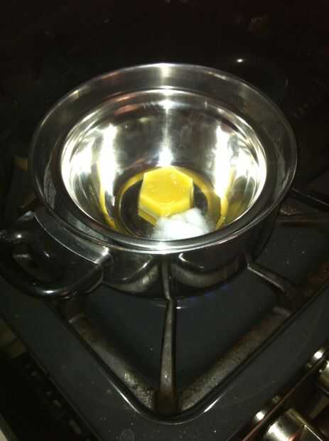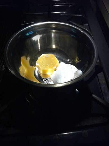 Lo primero es lo primero, vierta alrededor de 750ml (esto puede variar dependiendo del tamaño de tu olla) de agua en la olla y empieza a hervir. Luego, en su tazón de fuente en aproximadamente 1 parte de cera y 1 parte de aceite de coco o manteca de karité, va a utilizar aproximadamente 1 onza de cada uno porque estoy usando un frasco de 2oz. A continuación, una vez que hayas hecho esto colocar el vaso en la jarra de agua para hacer especie de un improvisado baño María. También se podría utilizar una caldera doble regular. Mientras se derretía mezclar de vez en cuando con una cuchara desechable.