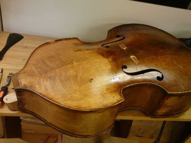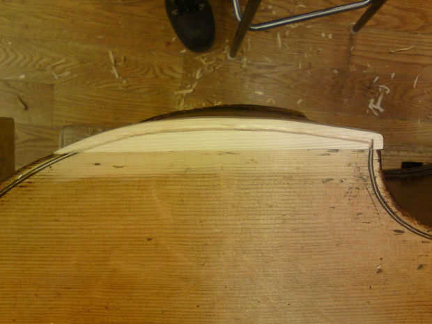 El archtop en el bajo se hace de dos enormes piezas de abeto, por lo que he encontrado una nueva pieza de abeto que tenía casi el mismo tipo de recolectora en el grano como el archtop. Tuve que lavar de la laca, por lo que podría conseguir una mejor imagen de todos los daños y perjuicios. Casi parecía aún más hermoso withouth la laca. Cuando vino el color oscuro, expuso algunos maravillosos rayos medulares que de lo contrario no habían sido vistos. Cuando la laca una vez más, hago Asegúrese de utilizar un color más brillante, para que se vean los rayos.