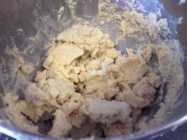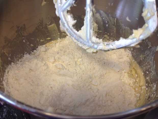 Añadir la mezcla de harina a la crema de mantequilla y azúcar y mezcla hasta combinar bien y forma una masa suave.