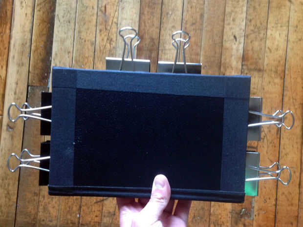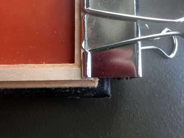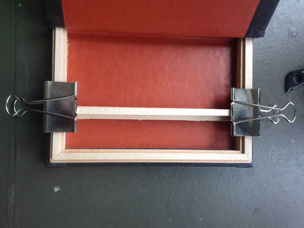 Utilizando una pequeña caja de ingletes y una sierra de tracción, corte tres piezas de 1/2"-Plaza de tilo para formar una"U"alrededor del perímetro de la cubierta posterior, con las dos barras cortas de la"U"dead-ending en la columna vertebral. Mina fue aproximadamente de 5-1/2 "x 8-1/2". Asegúrese de que alinear la pieza larga de la "U" con arandelas en el interior de la cubierta frontal. Fije la madera con un poco de pegamento del gorila y bastantes clips binder para mantener buena presión de sujeción. Superior del perímetro con una segunda capa de 3/8 "x 1/8" Tilo para hacer un borde escalonado.