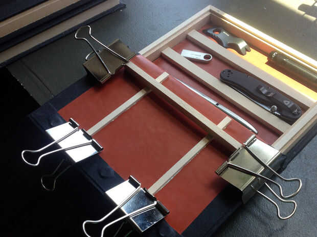 Encajar piezas 1/2"-Plaza de la bolsa dentro de la caja para hacer compartimentos para cada herramienta. Superior de las divisiones interiores con burlete de neopreno de 1/2". Reforzar el burlete adhesivo con algún pegamento para asegurar que se mantiene en su lugar.