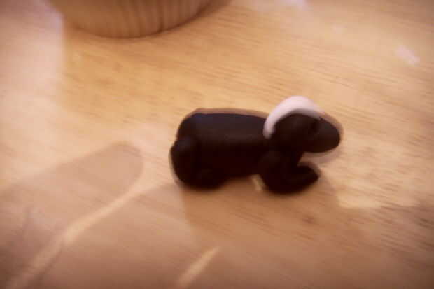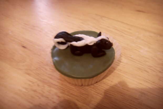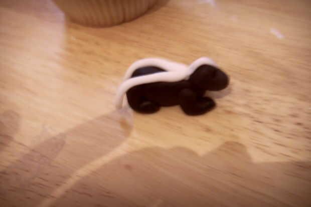 Pegue el skunk para la torta de la taza, después enrollamiento de la cola de su parte inferior a la superficie de la torta. Tubo en ojos negros y nariz. Añadir 2 triángulos negro para orejas.