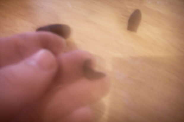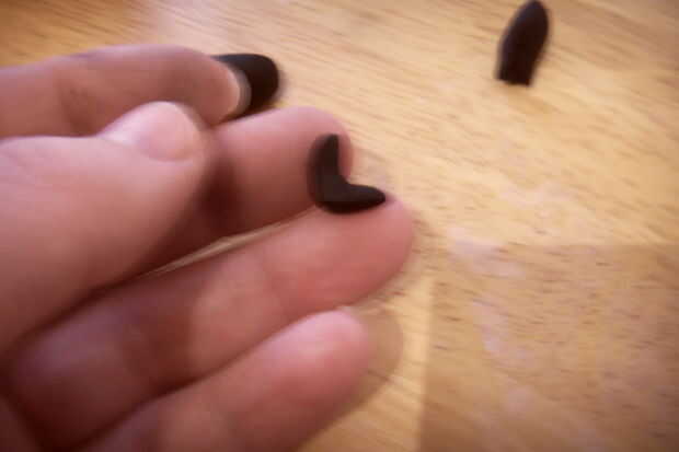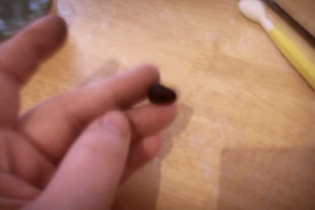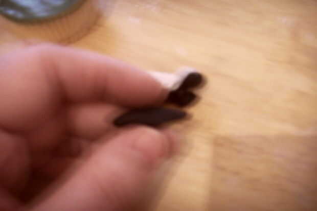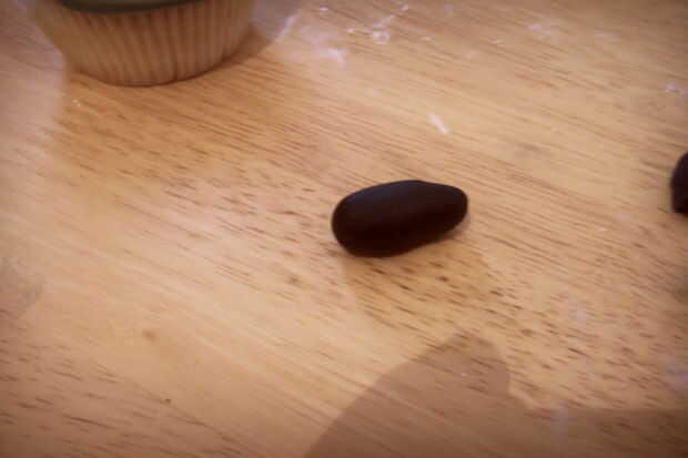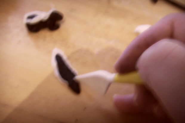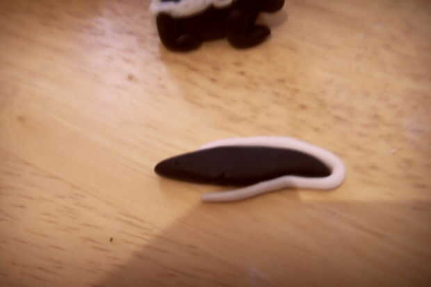 Rodar un 'chorizo' y aplanar en forma de lágrima larga. Un 'chorizo' más largo, más fino de blanco del rodillo, colocar alrededor del borde de la lágrima negra.