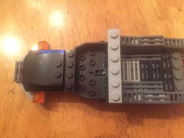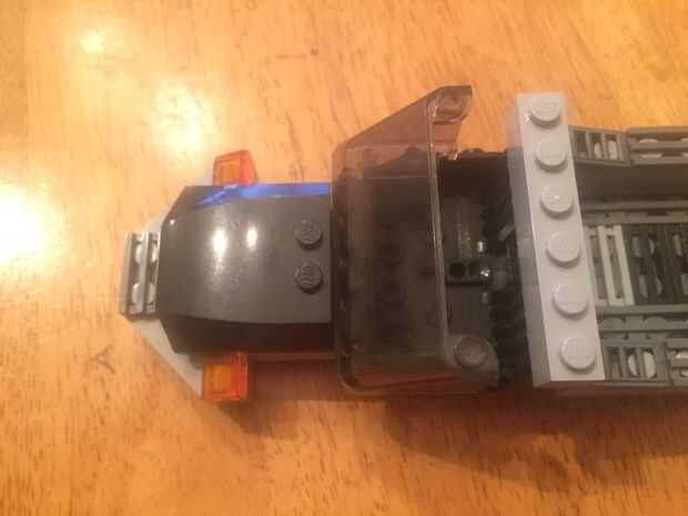 Paso 11: Colocar los dos faros naranja a ambos lados de las piezas gris claras inclinadas. Luego, coloque 6 x 1 sobre los asientos negros. Por último, coloque la pieza de ventana grande en la parte delantera de la zona de asientos