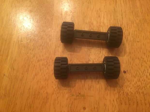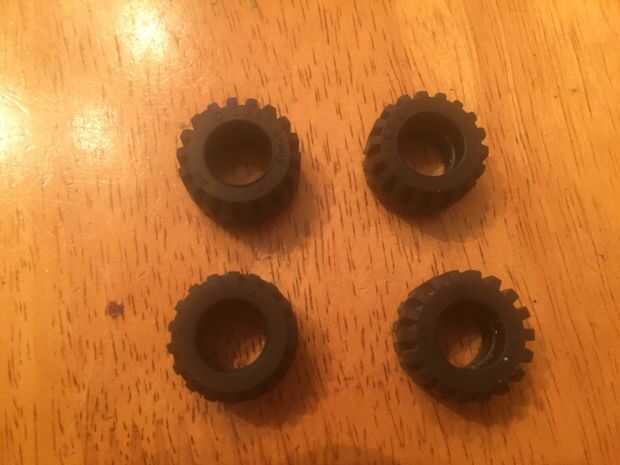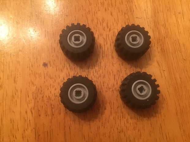 Paso 22: Poner los luz gris cilindros en las llantas negras. Luego, poner la instale las ruedas a las piezas de conexión