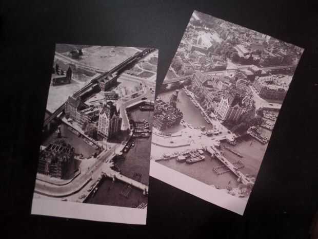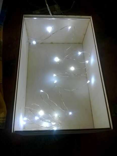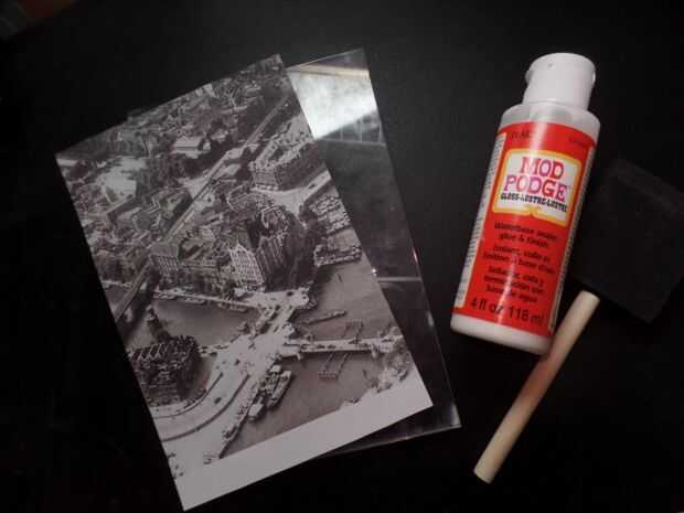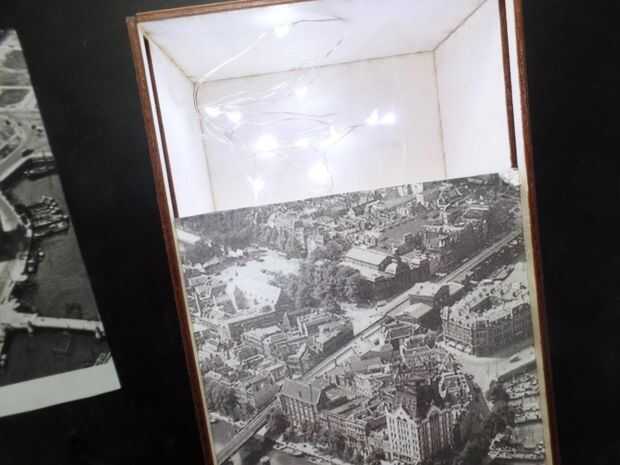 Nadat ik de lichtbak uitgesneden de heb, heb ik dobladillo en dirección gezet met lijm. IK heb vervolgens afbeeldingen twee geprint en deze op maat geknipt. De ene afbeelding (Rotterdam voor het bombardeo) heb ik se reunió con Mod Podge op het plexiglás geplakt. Andere afbeelding (bombardeo de Rotterdam na het) ligt proyecto de los op het. IK heb een gaatje en de voorkant van de lichtbak geboord en hier heb ik het lichtsnoer doorheen gedaan. De batería es dus buiten de bak, zodat deze makkelijker aan en uit gezet kan worden. Vervolgens heb ik het plexiglas en de bak geschoven. IK heb het de geprobeerd en boekvorm te maken, maar dit lukte niet, omdat de scharnieren niet bleven zitten. Het strookje hout fue te dun om hier schroefjes/spijkers en at de doen te met lijm bleef het niet zitten.
