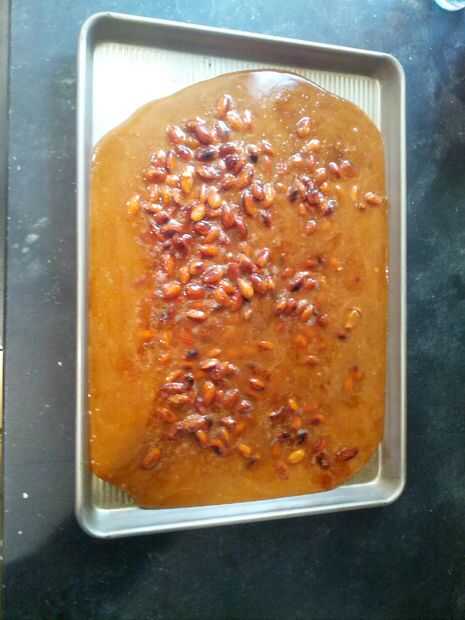 El caramelo líquido sale primero y se extenderá hacia fuera por sí mismo. Como las tuercas comienza a salir, trate de les vierte uniformemente sobre el caramelo.
