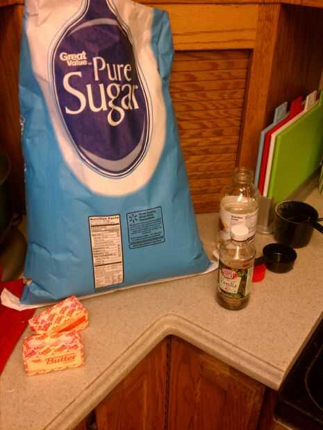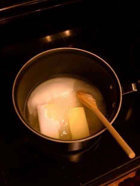 Se dará cuenta de que esto es sobre todo mantequilla y el azúcar. Pero se trata de las vacaciones, y no pensamos en hasta enero. Coloque todos los ingredientes en una cacerola. Tome un pedazo de papel aluminio y levante un poco los bordes para formar un tipo de pan que deje enfriar el caramelo de Cuándo se hace.