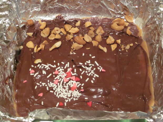 Si quieres que una capa de frutos secos o sprinkles agrega ahora encima el chocolate derretido.