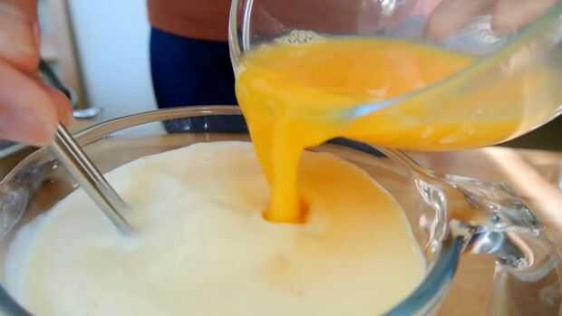 Añadir sal a los huevos agrietados en un bol y batir bien. Agregue la mezcla de huevos a la leche de soja y mezclar bien.