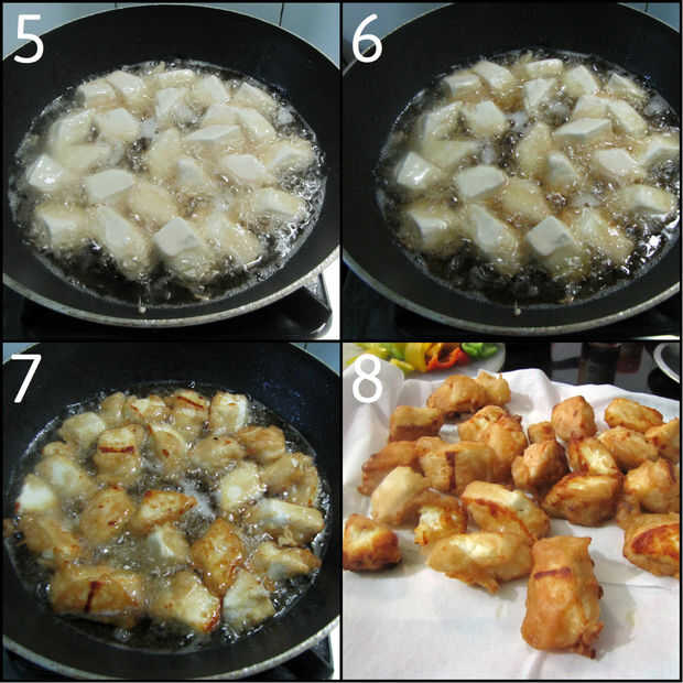 - Caliente el aceite en la cacerola y poner las piezas de tofu cubierto uno por uno (imagen 5), usted puede encontrar que pegarán entre sí mientras se freír, separados les con espátula (imagen 6).
