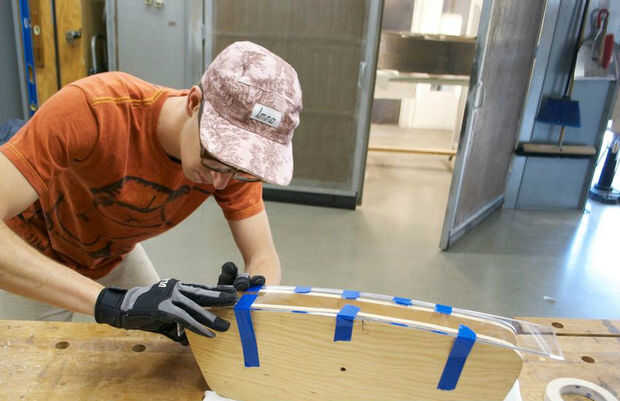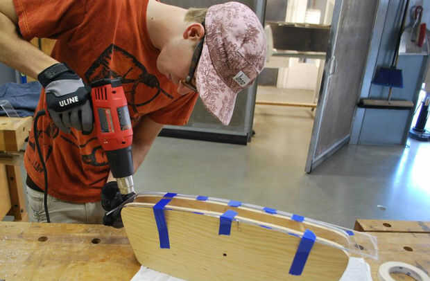 Cuidadosamente con cinta azul para mantener la pieza en su lugar, calentar y doblar el rectángulo a lo largo del perfil de la base. La mejor manera que he encontrado para doblar el acrílico es con una pistola de calor. Asegúrese de usar guantes para este paso, se calientan bastante antes de que comience la curva.
