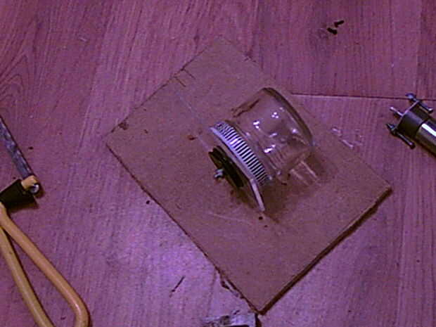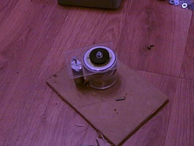 Después ponga un tornillo de la tapa del bote de mermelada, el plástico, una arandela, la polea, otra arandela y finalmente poner el tornillo en la parte superior. (si no utiliza el tipo de polea que tiene un cojinete que tenga problemas con esto porque la polea debe ser capaz de girar libremente, utilice cualquier método que trabaja para que la polea pueda girar, pero necesitará asegurarse de que la polea es como al ras con el plástico posible semillas si no se consigue alojadas entre los dos y la costumbre de la polea pueda girar.)