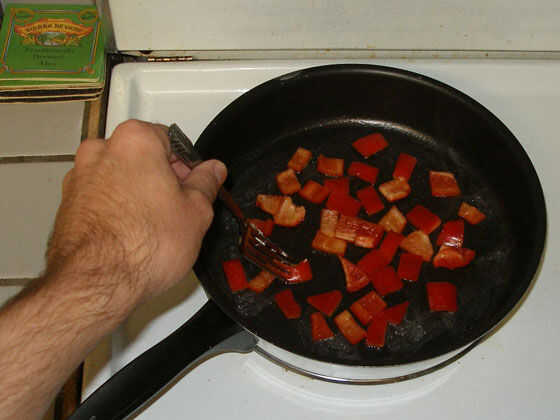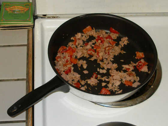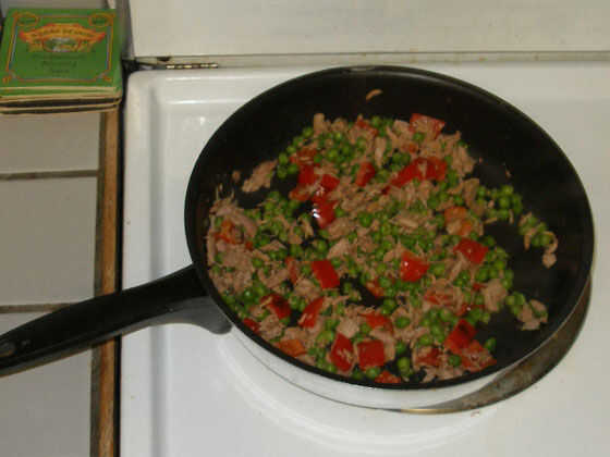 Estoy usando pimiento rojo que me se fríen durante un tiempo en la margarina a fuego lento. A menudo también lanzo algunas setas y el ajo, pero estoy todo ahora. Cuando siento que los extras estén casi cocinados lo suficiente, suele mezclar en el atún y un chorrito de jugo de atún al tipo de mezclarse los sabores. Luego a la derecha antes de todo la gama I echar los guisantes y la manivela hacia arriba el calor por un corto tiempo, tipo de tostado todo. Pero le animo a encontrar su propio camino, con sus propias golosinas. Ser creativo.