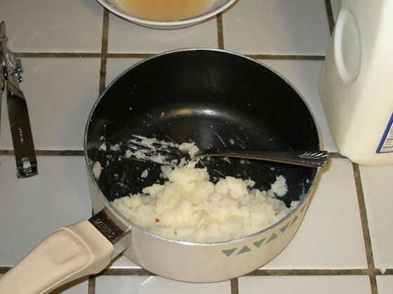 Cuchara el interior de la patata y poner en un bol grandote, dejando la piel en el plato. Ensuciarse encima de la carne de la patata un poco con un tenedor. Añadir la margarina/mantequilla, algunos jugo de atún, leche o alguna crema (blech) en cualquier relación que desee (voy en el atún, yo mismo) hasta lograr una consistencia que sea agradable a usted. Me gusta la mina como yo como mi mujer - cremoso, pero sin embargo, un poco grueso. Por último, la descarga en todas las otras cosas: queso, guisantes, atún, extras, cualquier especias que desee agregar, etc..; Luego, mezcla todo junto con las tripas del Papa.