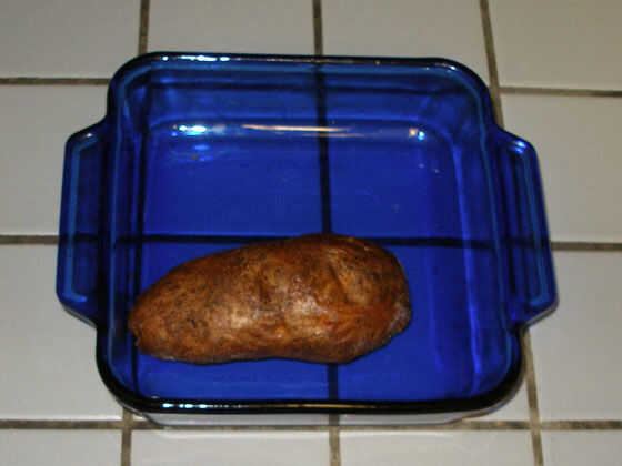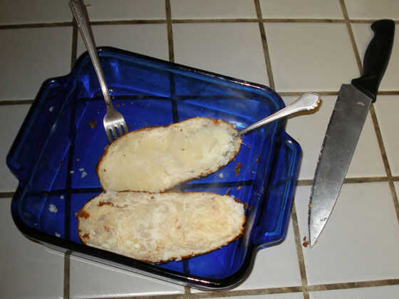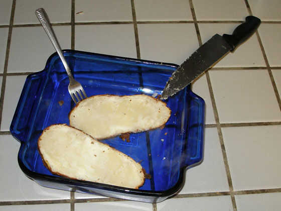 Don un tomaollas y abra el horno. Tu Papa se debe reclinada perezosamente donde lo dejó, buscando bastante al horno (incluso sus ojos pueden ser inyectados en sangre, har har). Coge el plato de la hornada cosita y empuje la patata con un tenedor o cuchara. Deje el horno. Ahora conseguir un cuchillo de sierra (plano tienen una tendencia a rasgar la piel en lugar de cortarlo, pero que va a trabajar en un apuro si eres cuidadoso) y cortar ese chico malo justo en la mitad longitudinalmente. Tratar de hacer las mitades como como posible.