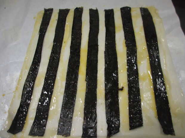 3. poner las algas. Usted puede poner el alga entero si te gusta más de algas. Quiero guardar mi alga marina para el sushi mañana. por lo tanto, acabo de cortar las algas y hacer una tira sobre la piel del rodillo de resorte ;)