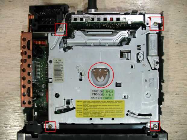 Desatornille los cuatro tornillos que se muestran en los cuadros rojo para quitar el reproductor de CD. Tenga cuidado al panel jack debajo!