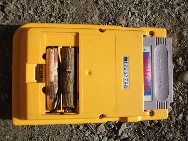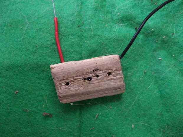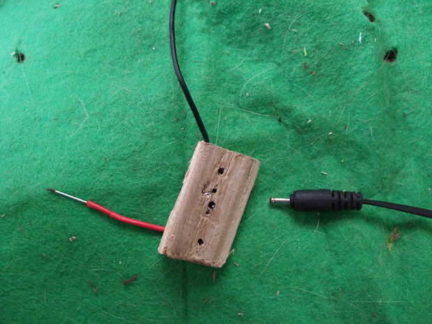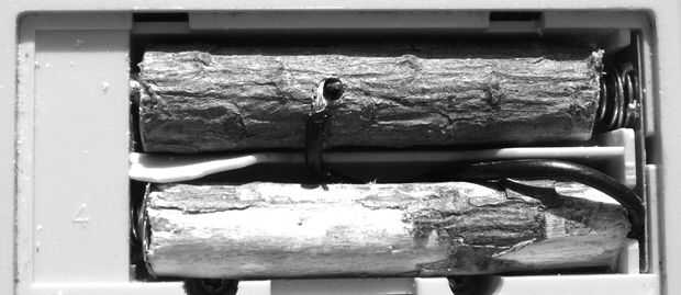 en este caso las ramas se cortan a la longitud y apropiadamente diámetro si triple A, doble A o baterías más grandes y hueco con un rayo de bicicleta afilado.