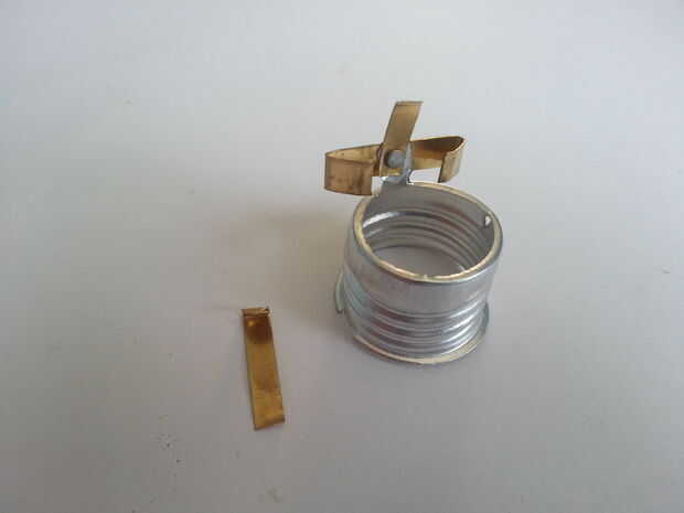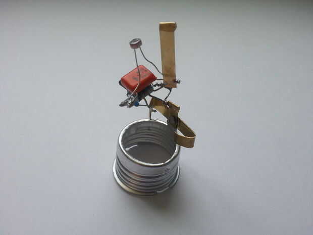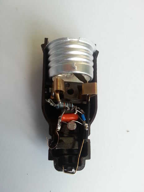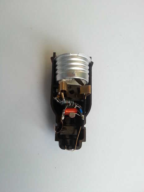 El circuito electrónico se conectará en serie con la bombilla, mientras que el adaptador se conecta en paralelo con la misma energía. Por lo tanto, se debe cortar uno del adaptador de contactos internos (neutro), como se muestra en la figura soldar las 2 secciones con el circuito electrónico como es muestra., también debe aplicar cinta al otro contacto (línea) de cobre como las cifras indican. Finalmente, unir las 2 partes del adaptador cuidadosamente, el tornillo se coloca y pone el contacto superior, con un destornillador plano.