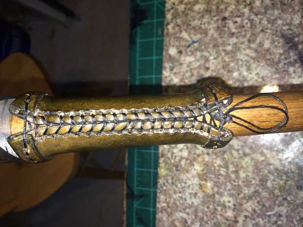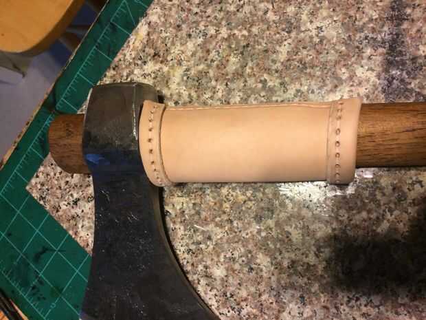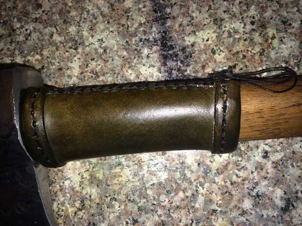 Un buen ajuste significa que los bordes de la piel están separados por aproximadamente 1/8" cuando envuélvalo alrededor del mango. Esto permitirá una más estrecha del cordón una vez que está todo hecho y menos (es decir No) la oportunidad de que pueda deslizarse alrededor en mientras que hace pivotar esta cosa en defensa de su vida. Una vez que tenga una longitud buena entonces yo cortar dos tiras ancho 1" en la misma longitud para hacer las tapas superior e inferior. Ahora apenas podía doblar encima y puntada hacia abajo, pero yo quería tener el lado (liso) de grano de la piel mostrando así que a menos que alguien me puede decir de una mejor manera de hacer esto con una sola pieza de piel sin cortar, esto es lo único que tiene sentido para mí. Una vez que mi piel fue cortada al tamaño había manchado todo con un Gel marrón antiguo que ya tiene el sellador y deje seco. Yo pulir a alto brillo y de perforación de agujeros para coser.