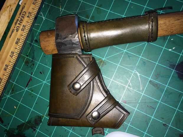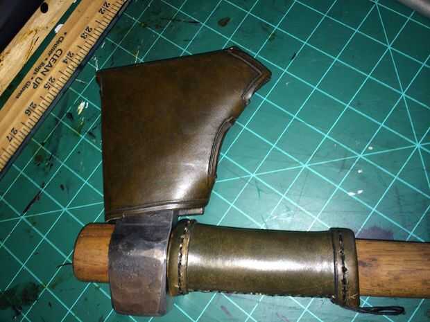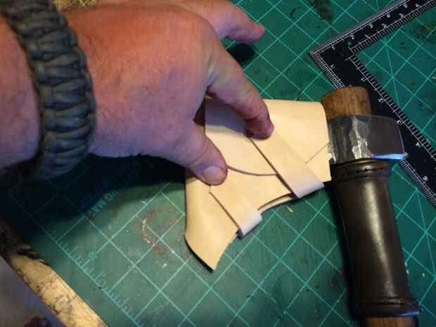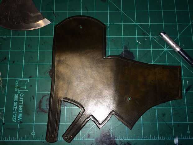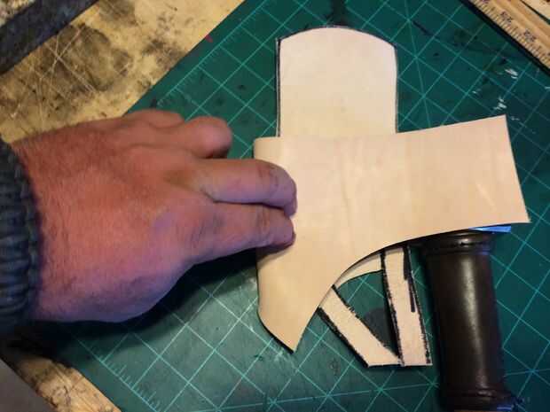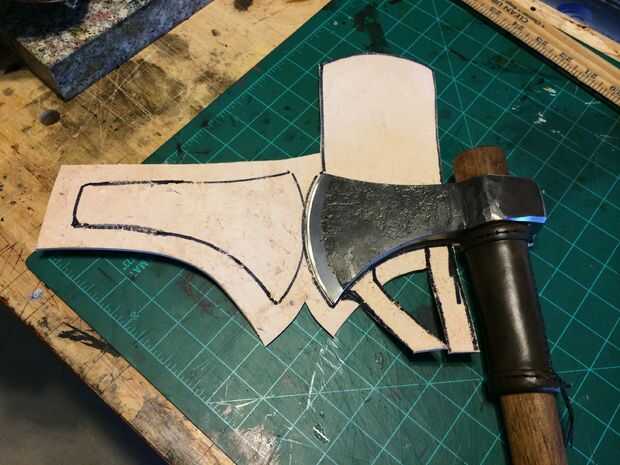 Debido al diseño general, el propietario quería mantenerlo simple y simplemente tienen la cubierta de abrigo solamente alrededor de la hoja. Con todos los paneles y las correas y remaches y broches de presión que esto puede empezar a añadir mucho peso, que hace movimientos normales torpes. Para minimizar el peso y la complejidad diseñó una cubierta de una sola pieza de 6 oz veg vaca curtida ocultar. Empecé poniendo la cabeza de hacha en el lado (áspero) de carne de la piel y localizar el perfil de la cabeza. Manteniendo la cuchilla sobre la piel había girado la haft hasta el halcón se enfrentaba a su propio contorno y trazó el perfil de la hoja otra vez. Estos dos perfiles de doblan al corte, para crear el cuerpo de la vaina. Algunos fabricantes del cuchillo, aficionados y entusiastas dirán sobre tiras de welt es necesarias para mantener la cuchilla de corte costura/cordón, pero porque nosotros estamos plegable esto no necesitamos uno. En la misma hoja de cuero sacó la tapa y las correas que se sujetan todos juntos. Agregué 1/2" de la frontera todo el camino alrededor para darle cierto margen, pero que resultó para ser innecesario. Dibujar la aleta que se extiende hacia arriba desde la parte superior de la cabeza de hacha y luego dibujar dos correas de la parte inferior del perfil de la cabeza de hacha. Usted puede jugar con los ángulos de las correas pero este diseño trabajado bien para este halcón. A continuación usted corta todo en una sola pieza, manteniendo la aleta y las correas conectadas al cuerpo de la vaina. Envuélvala alrededor de la hoja, bajar la aleta y luego traer las correas hasta donde quiere sentarse. Perforar un agujero pequeño marcador a través de la correa en la tapa y el cuerpo y luego ya sabes dónde instalar sus broches de presión para el cierre. Creé un pequeño borde alrededor todo por un poco de estilo y lo mancharon marrón antiguo, para que coincida con el abrigo de mango. Establecer sus broches de presión y abrigo a rascal.