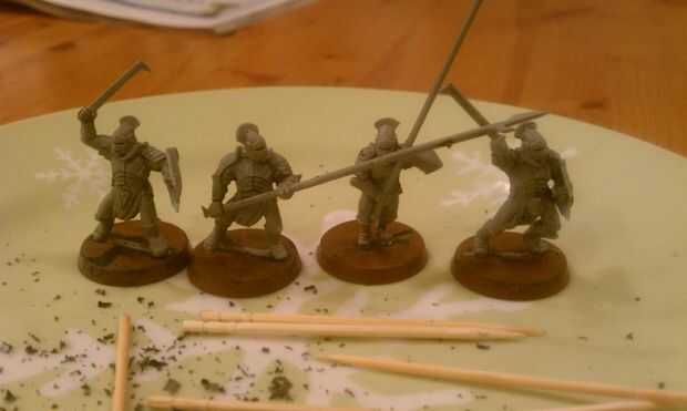 Esta parte puede tomar un tiempo. Simplemente raspe en el modelo con un palillo hasta que es demasiado aburrido. En los cuatro modelos que ven abajo que pasé 2 horas recogiendo al raspado y recogida en ellos. Su lento pero fácil. Se puede hacer escuchando música o viendo una película (Señor de los anillos en mi caso).  Se centran en las áreas donde la pintura realmente cubre detalle del modelo. Usted puede utilizar alfileres o agujas en lugar de palillos de dientes, pero que pueden rayar los modelos.
