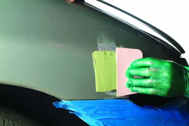 Cuando estés seguro de la chapa es ligeramente por debajo de la superficie de los alrededores, utilice una lijadora de disco con papel de grano 36 para eliminar toda pintura y cartilla de la abolladura y alrededores. Esto le dará el llenador del cuerpo una superficie áspera (llamada diente) para pasar a una vez que ha endurecido. Después de mezclar bien el relleno con endurecedor, liso en la zona dañada con un aplicador plástico de relleno. El relleno se semihardens en 10 a 15 minutos a la consistencia de queso cheddar.