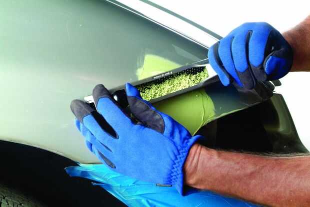 En este punto es fácil de alisar con un archivo de cuerpo. Utilizar el archivo para derribar el relleno por lo que es ligeramente superior a la reparación terminada va a ser. Después de unos 15 a 30 minutos, el relleno se convierte en duro. En este punto puede utilizar una mano o con lijadora movimiento accionado por aire con papel de grano 80 para poner el relleno hasta el nivel del cuerpo. Si ves alguna mancha de metal brillante, brillante en o alrededor del relleno, esas áreas son altas. Utilice el extremo acentuado (Draft) de un martillo de cuerpo en golpee ligeramente, luego rellenar y resand.