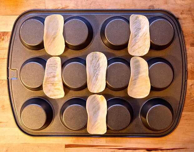 Método 2: voltear tus bollitos para que descanse boca abajo. Coloque sus envolturas de wonton entre los receptáculos del mollete de la olla para que queden en forma de una concha de taco. El lado de la mantequilla de su envoltura debe estar contra el pan, hacia abajo. Coloque su conchas y volcada la bandeja en el horno. Hornear a 350F durante 4-5 minutos o hasta que estén doradas. Cuidadosamente retire sus cáscaras recién horneados de tus bollitos y déjelos enfriar colocando la cáscara boca abajo en su cocina.