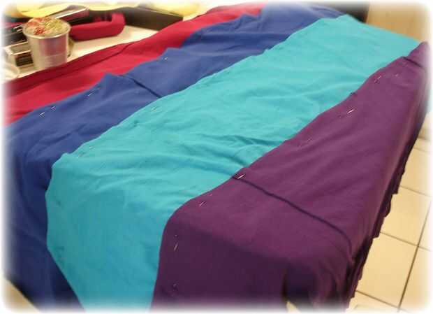 Pasador todas las tiras juntas, asegúrese de que todos los flecos están de un lado. (ese lado será el frente - usted puede coser más adelante)