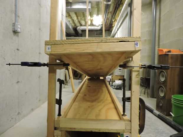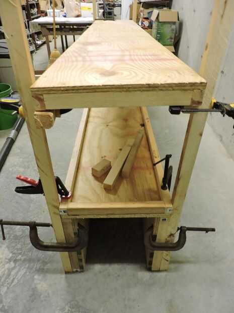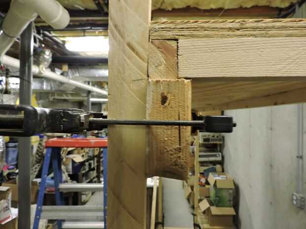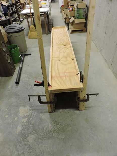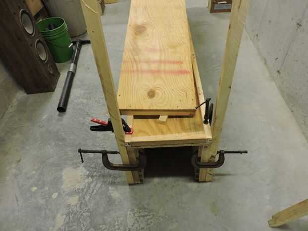 Como el ribete del estante solía utilizar una madera bastante pesada como 2 x 4 para los soportes. Pero ahora para esta unidad una vez más utilizaré 2 x 4 Ripeado en tercios. El verdadero truco aquí es conseguir la unidad a levantarse mientras que la construcción es aún incompleta. Esto es aún más difícil trabajar solo. Tengo un par de trucos para esto que involucran a un gran número de abrazaderas. Las fotos dicen mucho de la historia.