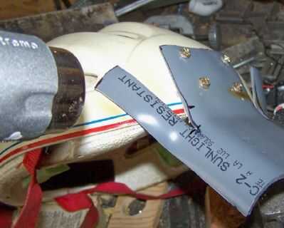 utilicé cuatro tornillos en la sección de centro de apoyo.  Utilice la pistola de calor necesario para un buen ajuste.  Aquí ver la pistola de calor en uso para calentar el apoyar de lado antes de perforar y fijar con un tornillo.  Hacer lo mismo con el soporte lateral en el otro lado.  Es una buena idea para comprobar el ángulo de 130 grados en el paso 5 varias veces cuando proceda.  Tratar de calentar el PVC sin fundir o quemar el casco.