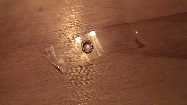 Primero tomar el pequeño lente del láser y pegar sobre la cinta.