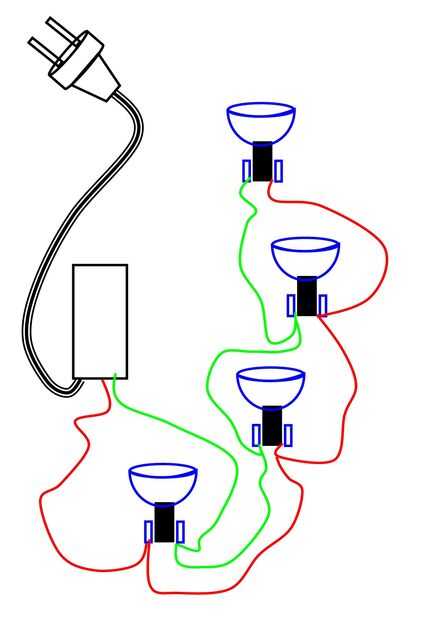 El cableado es simple. Con un pedazo de alambre normal de 230 v Conecte los extremos de la primaria (en) del conductor. En el otro extremo de ese cable se puede conectar un enchufe. (Cán usted conectar un enchufe, eh?). Cortar 8 trozos de alambre de bajo volt. La longitud depende de donde usted quiere poner la luz más tarde. Mina son aprox. 50 cm. hacer bucles en los extremos de los cables. Fije todos los zócalos a los demás y el último de ellos a la sec (salida) del controlador de 12 voltios. Casi que cada tornillo tiene dos lazos, sólo la primera lámpara tiene en alambre a cada lado.