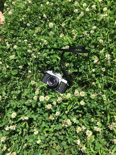 2. apoyos, tales como flores, o una cámara vintage que no funciona