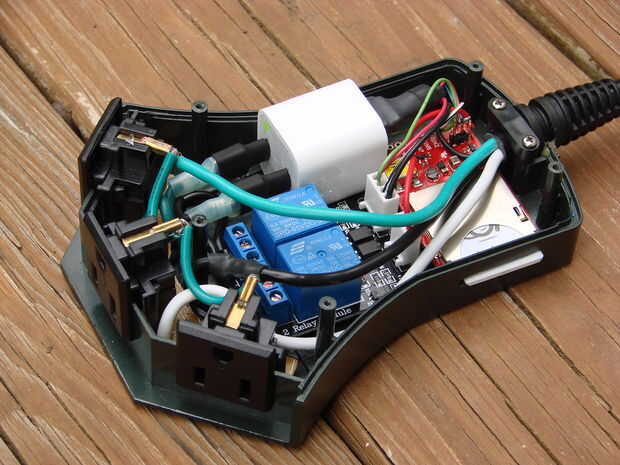 Agarré un destornillador y abrir la unidad de Stanley. El interior parece ser perfecto para una modernización de Electric Imp (http://www.electricimp.com) con el mínimo esfuerzo... o así que pensé. Mis luces de la tienda fueron encabezados en la nube de internet y accesibles desde cualquier lugar con mi explorador web o Smartphone. Lamentablemente el plan para simplemente reemplazar el circuito de RF con un Imp eléctrico golpeó un roadbump importante porque la fuente de alimentación a la regleta de Stanley no puede entregar corriente suficiente para alimentar el diablillo eléctrico. El Imp requiere aproximadamente 400 mA en transmisión WiFi, para que el hack resultó para ser más invasiva que tenía la intención, involucrando un Imp, cargador del teléfono móvil y placa de relé metió con calzador en el recinto de Stanley.