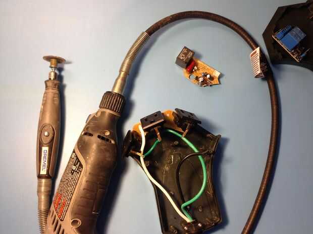 Hay 2 grandes jefes plástico moldeados en la carcasa de plástico inferior que fue montaje de la Junta de RF original. Estos jefes pueden cortarse con un par de cortadores y alisados aún más con una herramienta dremel. Imp y el relé de placas de circuito impreso se pegan a la base. Eliminación de los jefes es necesario para que la placa de relé se puede montar bajo lo suficiente como para despejar la tapa cuando se vuelve a montar la unidad de Stanley.