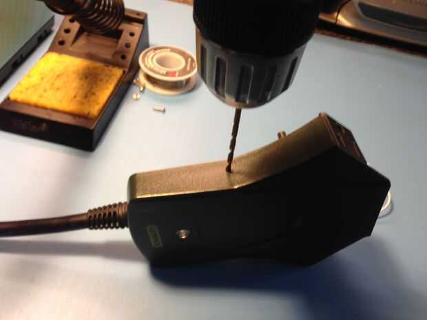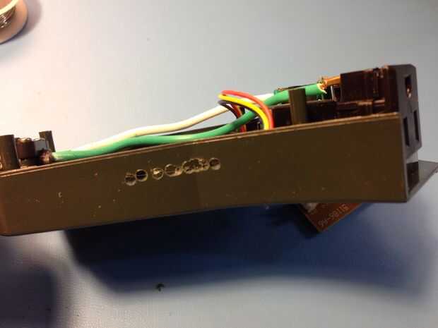 Para proporcionar una ranura para la tarjeta eléctrica imp, una ranura debe hacerse en el lado de la caja. Al principio tenía intención de usar la unidad Stanley construida en regulador para alimentar a la imp. Cuando esto resultó para ser la alimentación inadecuada, tuve que reubicar la ranura en el lado opuesto de la carcasa inferior. Para hacer la ranura, perforar varios agujeros 1/16" en aproximadamente una línea recta y luego use un pequeño archivo para encuadrar la ranura. No hacer la ranura donde muestran estas fotos... mira las fotos de la finales en el ultimo paso para ver donde debe ir la ranura!