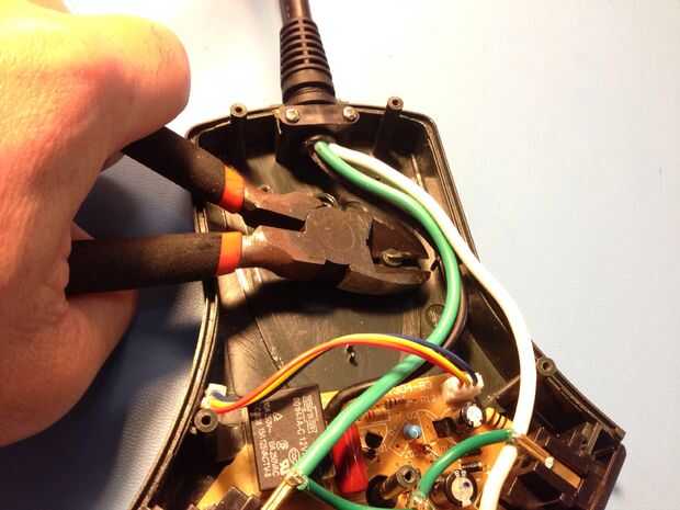 Retire la placa de circuito principal de la cáscara. Con una herramienta Dremel con un disco de corte, corte cuidadosamente todo el circuito existente por lo que tendrás que dejar solamente la parte AC del circuito como se muestra en las fotos. Corte el PCB es necesario proporcionar espacio para el nuevo relé que conmuta las salidas dentro y fuera. Quiere dejar las pistas principales de AC compatibles con las tomas de corriente.