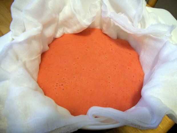 Vierta la mezcla en su capa de estameña gruesa, o la toalla de cocina fina. El objetivo de este paso es filtrar todas las partículas de tomate, dejando sólo el jugo y los compuestos aromáticos del tomate para el uso de su opción.