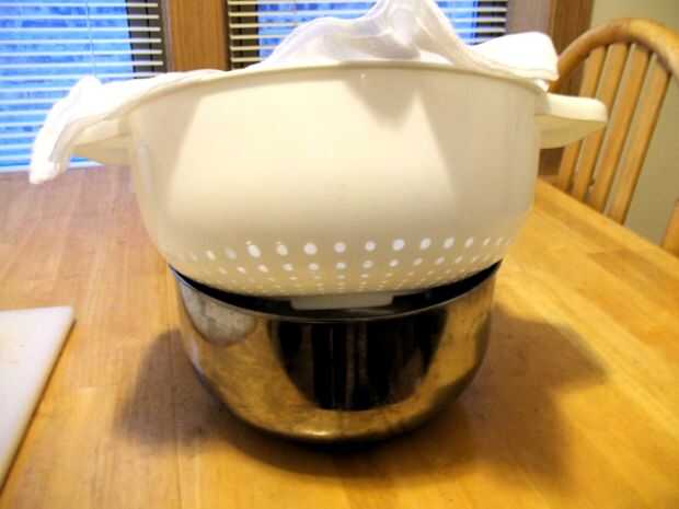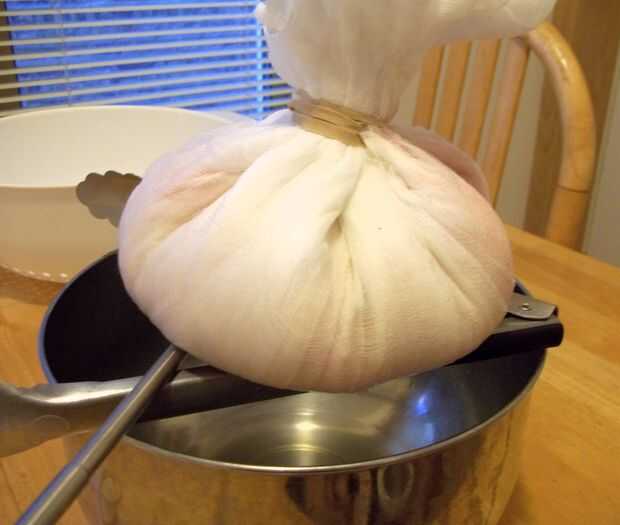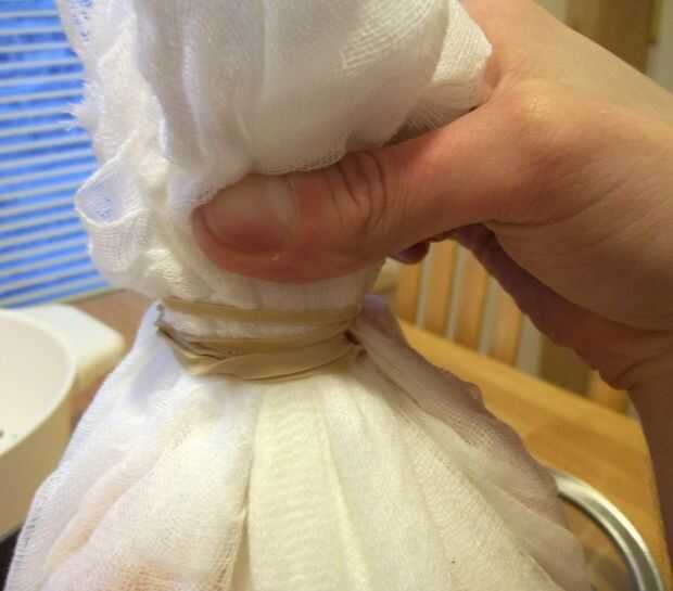 En este punto, atar el filtro firmemente como una bindle hobo como hizo y suspender sobre el receptáculo de su elección, o dejarlo sentarse en un tamiz de malla grande y poco a poco por goteo a través de.