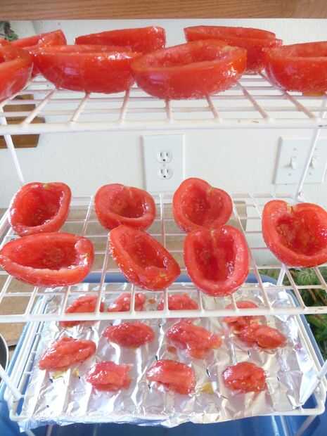 Compruebe los tomates después de 4 a 6 horas. Darles la vuelta en el estante de secado y continuar asando hasta que se firma suave, correosa y secan. Podría tomar varios días antes de que los tomates están listos para almacenar asi que tengan paciencia. Realmente las cosas buenas vienen a aquellos que esperan! ;-D